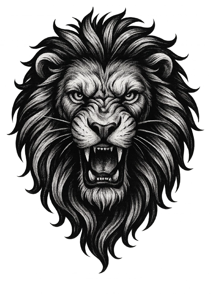 Kraftvolles Löwenkopf-Motiv mit beeindruckender Mähne für Tattoos.