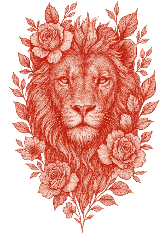 Majestätisches Löwenportrait umgeben von Rosen in einer einzigartigen Tattoovorlage.