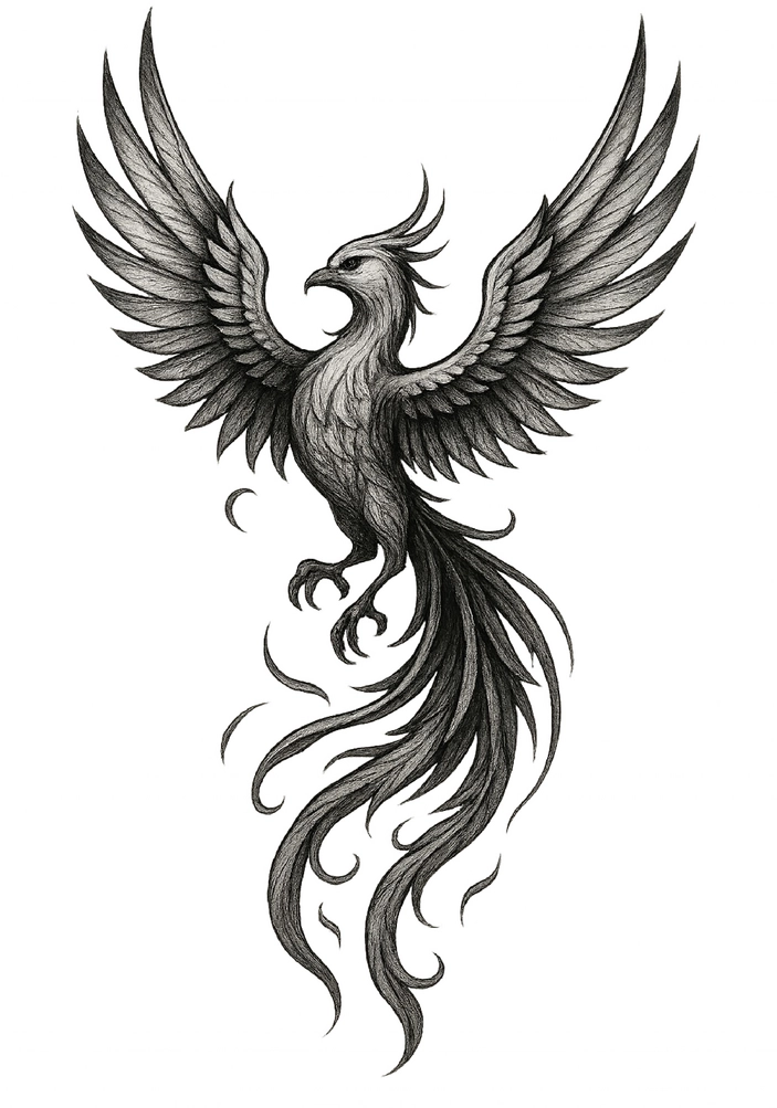 Eine faszinierende Tattoovorlage eines Phoenix, der Stärke und Wiedergeburt symbolisiert.