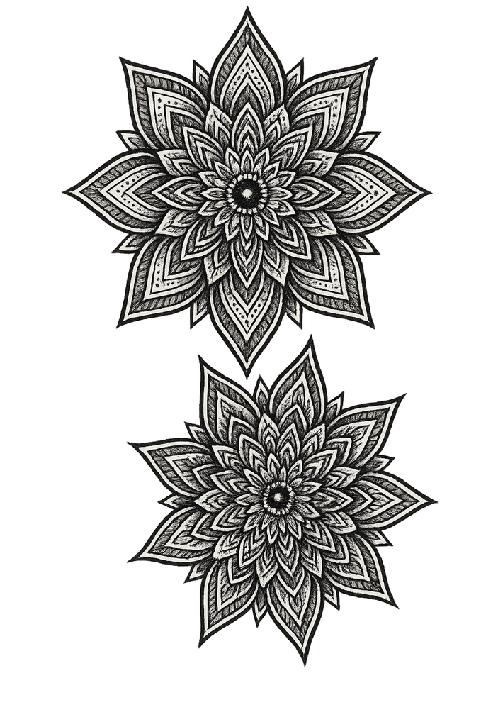Zwei symmetrische Mandala-Tattoovorlagen im schwarz-weißen Stil.