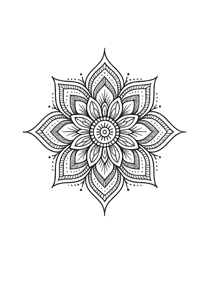 Diese Tattoovorlage zeigt ein detailliertes Mandala, das durch seine symmetrischen Formen und feinen Linien besticht. Die filigranen Muster sind perfekt für eine Brusttattoo, das sowohl ästhetisch ansprechend als auch symbolisch bedeutend ist.