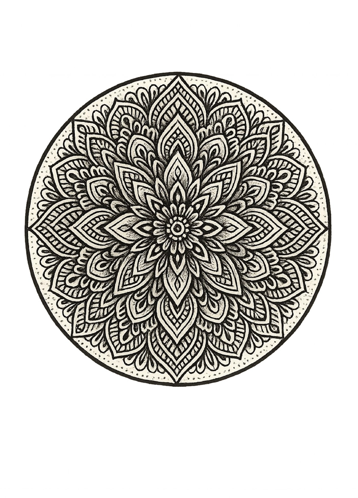 Diese Tattoovorlage zeigt ein detailliertes und kunstvolles Mandala, das durch seine symmetrische Anordnung und filigranen Muster besticht. Die zarten Linien und die ausgeklügelte Struktur machen dieses Design ideal für eine Bauch-Tätowierung, die sowohl ästhetisch ansprechend als auch bedeutungsvoll ist.