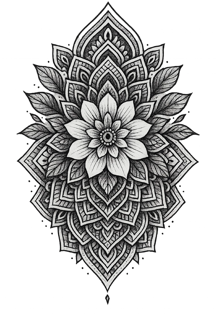 Ein beeindruckendes Mandala mit floralen Elementen, perfekt für ein Rücken-Tattoo.