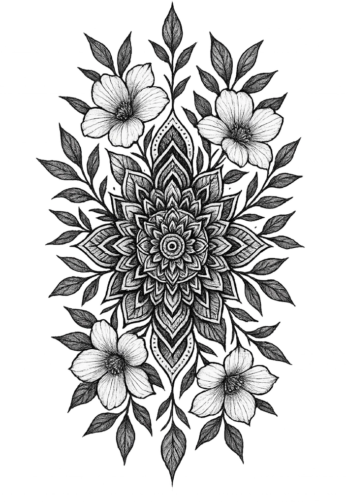 Diese Tattoovorlage zeigt ein beeindruckendes Mandala mit floralen Elementen. Die symmetrische Anordnung der Blüten und Blätter verleiht dem Design eine harmonische Ausstrahlung. Ideal für Rücken oder andere Körperstellen, bietet dieses Motiv eine perfekte Kombination aus Spiritualität und Ästhetik.
