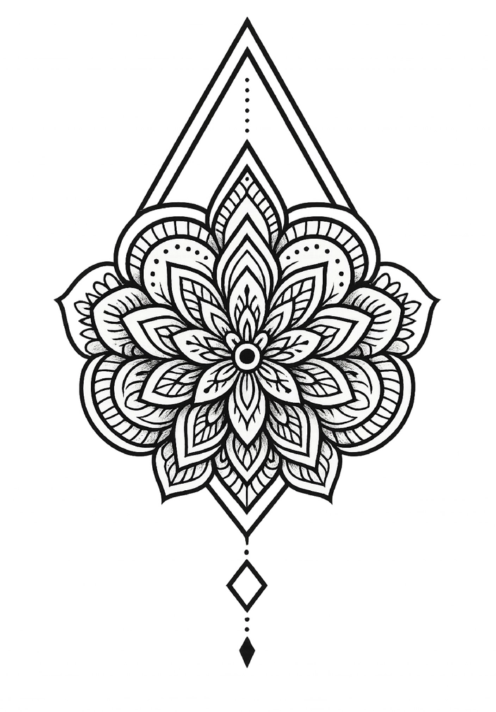 Diese Tattoovorlage zeigt ein kunstvolles Mandala, das durch seine symmetrischen Formen und filigranen Details besticht. Die Kombination aus geometrischen Elementen und floralen Mustern verleiht dem Design eine harmonische Ausstrahlung, die sowohl ästhetisch ansprechend als auch beruhigend wirkt.