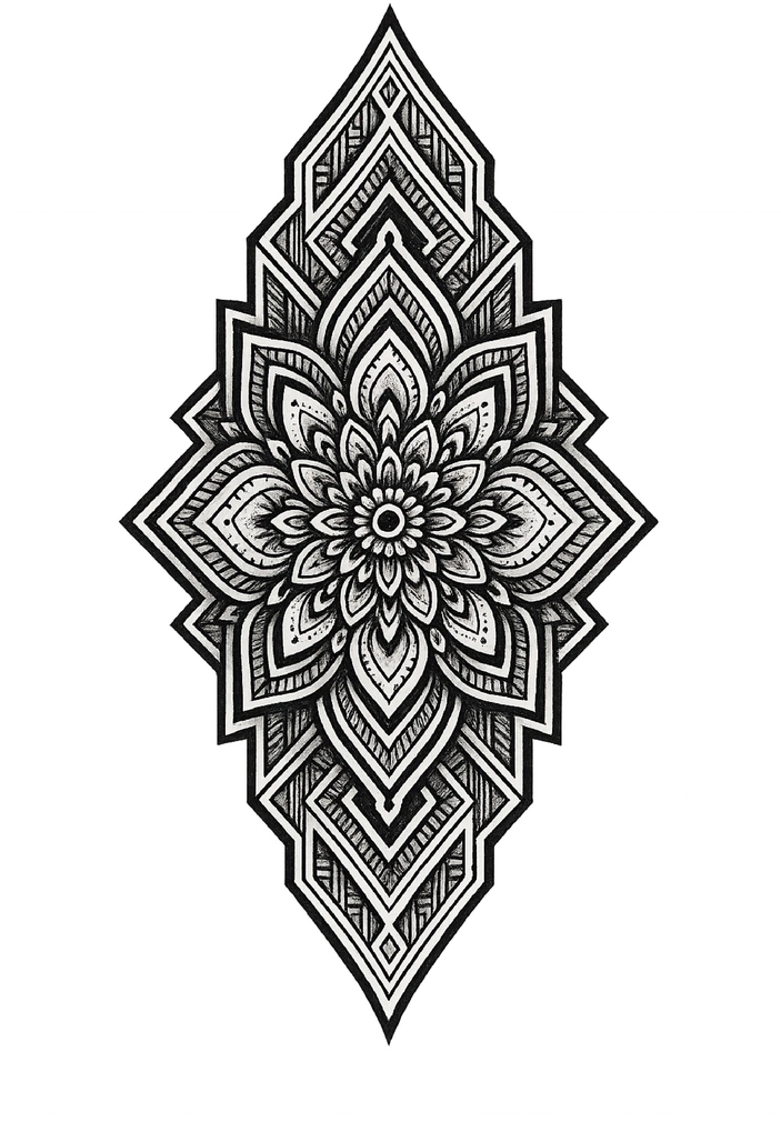 Diese Tattoovorlage zeigt ein beeindruckendes Mandala mit filigranen Mustern und geometrischen Formen. Die schwarz-weiße Gestaltung bringt die Details besonders zur Geltung und eignet sich hervorragend für den Wade- oder Unterschenkel. Der kunstvolle Entwurf strahlt eine harmonische und meditative Energie aus.