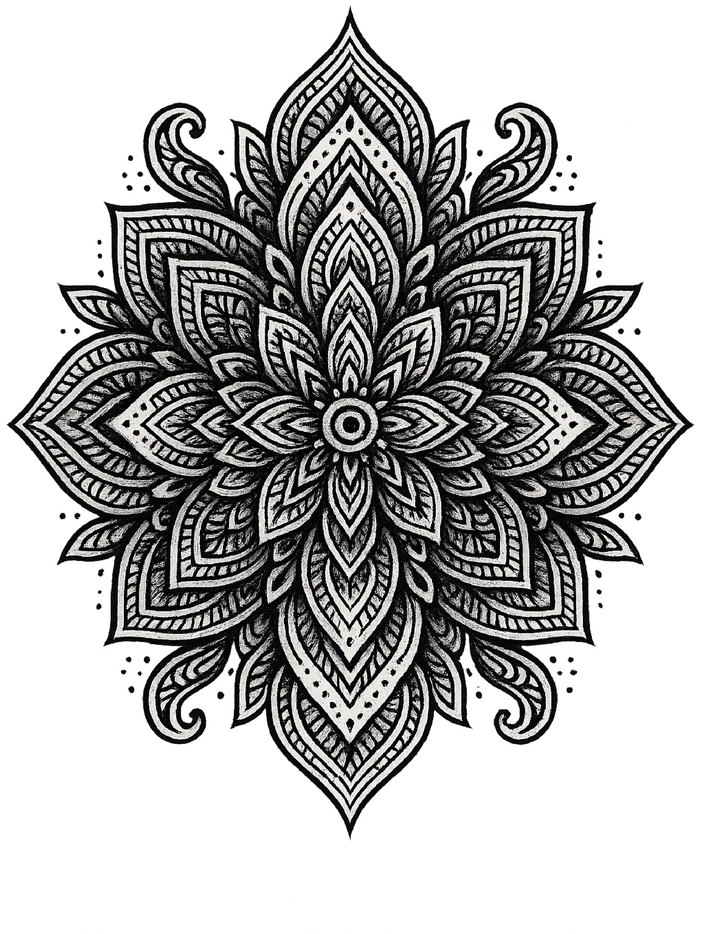 Die Tattoovorlage zeigt ein beeindruckendes Mandala mit komplexen, symmetrischen Mustern. Die kunstvollen Linien und Details vermitteln ein Gefühl von Harmonie und Ästhetik, was sie zu einer idealen Wahl für Oberarm-Tattoos macht.
