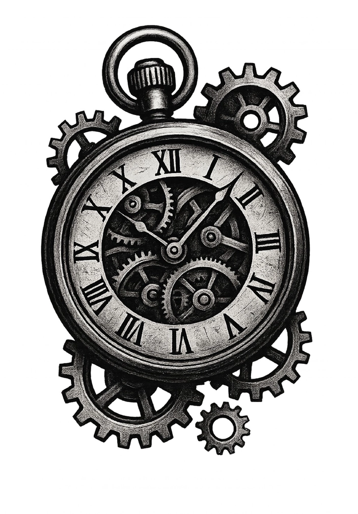 Detailreiche Tattoovorlage einer mechanischen Uhr mit Zahnrädern und klassischem Ziffernblatt.