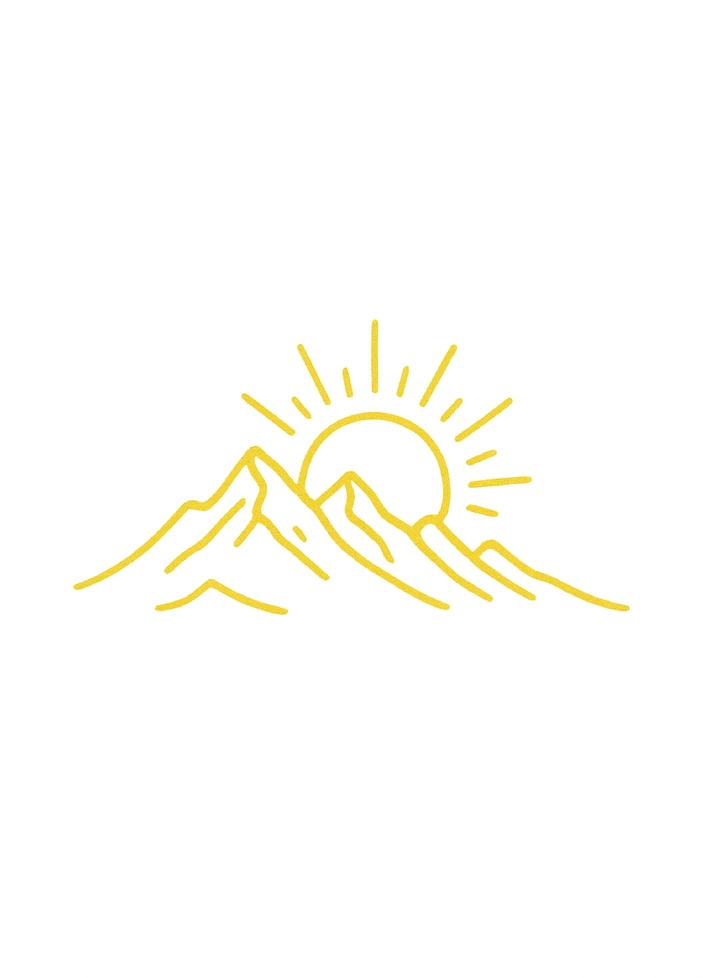 Diese Tattoovorlage zeigt ein minimalistisches Design mit stilisierten Bergen und einer strahlenden Sonne. Die klaren Linien und die helle Farbgebung verleihen dem Motiv eine moderne und elegante Ausstrahlung, ideal für Tattoo-Liebhaber, die eine Verbindung zur Natur suchen.