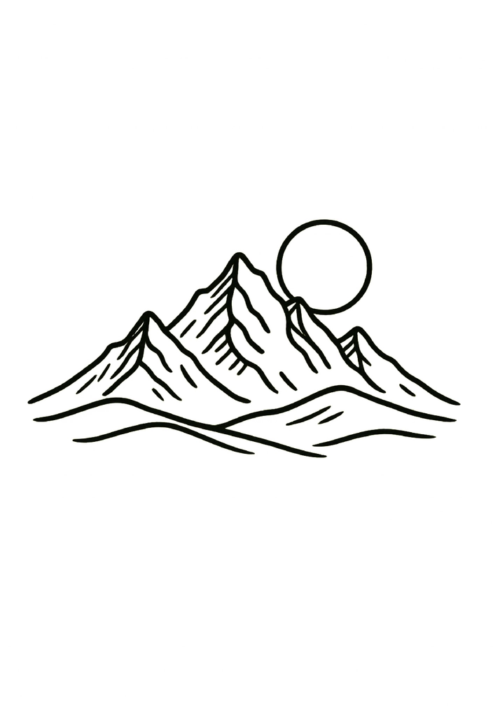 Minimalistisches Bergpanorama mit Sonne als kreative Tattoovorlage für Naturliebhaber.