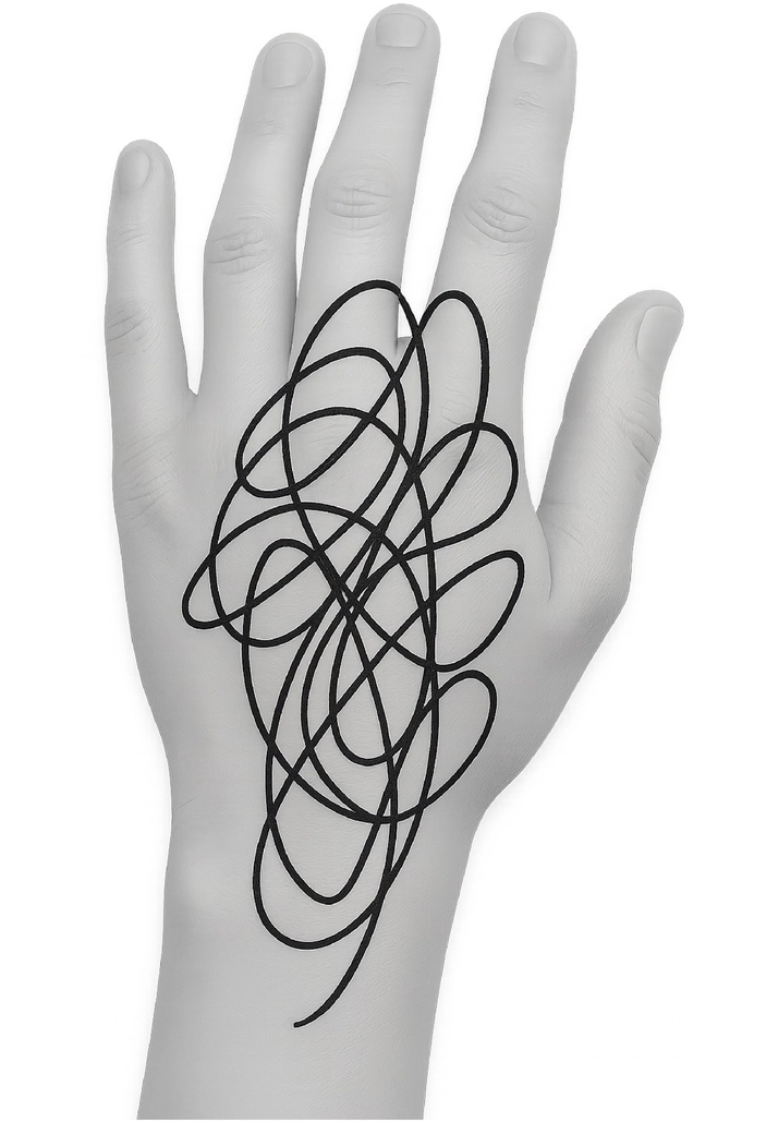 Das Bild zeigt eine abstrakte Tattoovorlage, die durch überlappende Linien auf der Handfläche dargestellt wird. Die geschwungenen und verschnörkelten Formen erzeugen einen dynamischen und künstlerischen Eindruck, der sich hervorragend für ein einzigartiges Tattoo eignet.