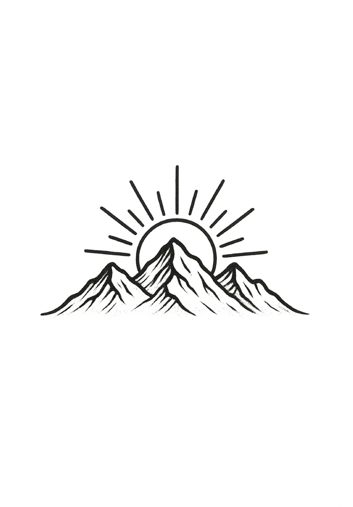 Die Tattoovorlage zeigt eine stilisierte Berglandschaft mit einem Sonnenaufgang. Die geometrischen Formen der Berge werden von strahlenden Linien umgeben, die den Himmel symbolisieren. Dieses Motiv vermittelt ein Gefühl von Freiheit und Verbundenheit zur Natur.