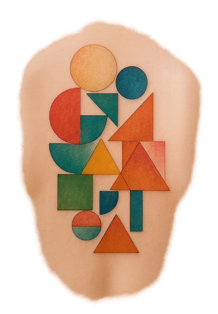 Abstrakte geometrische Formen in lebendigen Farben für ein kreatives Tattoo-Design.