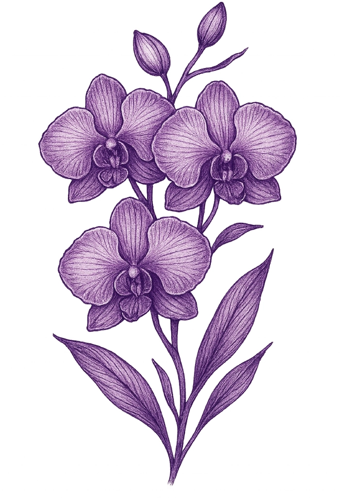 Eine elegante Tattoovorlage mit lila Orchideen als Motiv für Frauen.