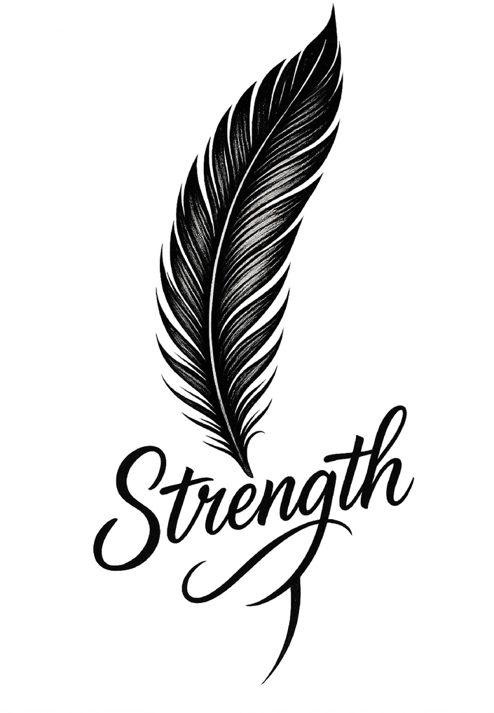 Diese Tattoovorlage zeigt eine kunstvoll gestaltete Feder, die mit dem Wort Strength kombiniert ist. Die elegante Darstellung symbolisiert Stärke und Freiheit, ideal für eine persönliche Botschaft. Die geschwungenen Linien der Feder verleihen dem Tattoo einen besonderen Ausdruck und machen es zu einem einzigartigen Kunstwerk auf der Haut.