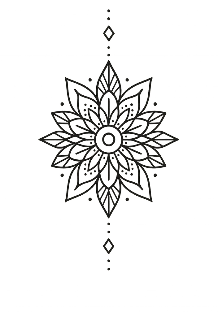 Diese Tattoovorlage zeigt ein filigranes Mandala, das durch seine symmetrischen und detaillierten Elemente besticht. Die zentrale Blütenform wird von zahlreichen Blättern und Punkten umgeben, was der Vorlage eine harmonische Ausstrahlung verleiht. Ideal für diejenigen, die ein spirituelles oder künstlerisches Tattoo suchen.