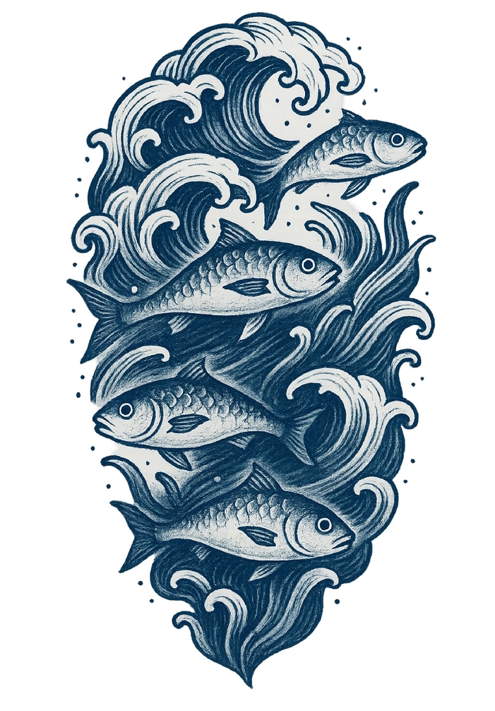 Diese Tattoovorlage zeigt eine dynamische Darstellung von Fischen, die durch kraftvolle Wellen schwimmen. Die harmonische Kombination aus Wasser und Tiermotiven vermittelt ein Gefühl von Bewegung und Lebendigkeit.