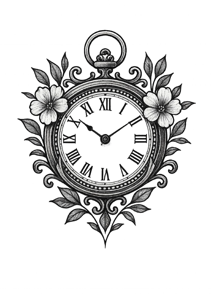 Diese Tattoovorlage zeigt eine kunstvoll gestaltete Uhr, umgeben von floralen Elementen. Die römischen Ziffern und die filigranen Details verleihen der Vorlage einen eleganten Touch.