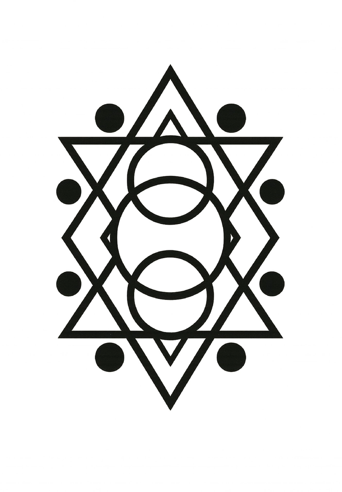 Diese Tattoovorlage zeigt ein faszinierendes geometrisches Muster, das aus verschiedenen Formen wie Dreiecken und Kreisen besteht. Die symmetrische Anordnung verleiht dem Design eine harmonische und ansprechende Ästhetik, die sowohl als Körperkunst auf dem Bauch als auch als symbolisches Element interpretiert werden kann.