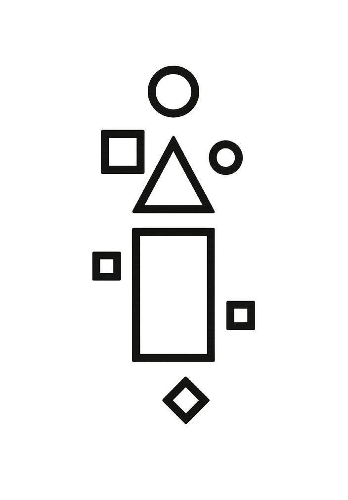 Diese Tattoovorlage zeigt eine ansprechende Anordnung geometrischer Formen, darunter Kreise, Quadrate und ein Dreieck. Die minimalistische Gestaltung eignet sich hervorragend für ein Finger-Tattoo und spricht besonders Frauen an, die schlichte und moderne Motive bevorzugen.