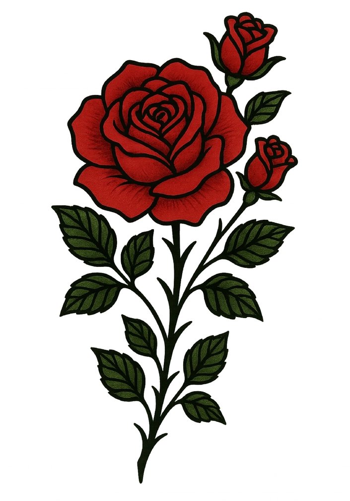 Die Tattoovorlage zeigt eine schöne rote Rose mit zwei kleinen Knospen und grünen Blättern. Diese Vorlage vereint Tradition und Ästhetik und eignet sich hervorragend für Liebhaber von Blumenmotiven.