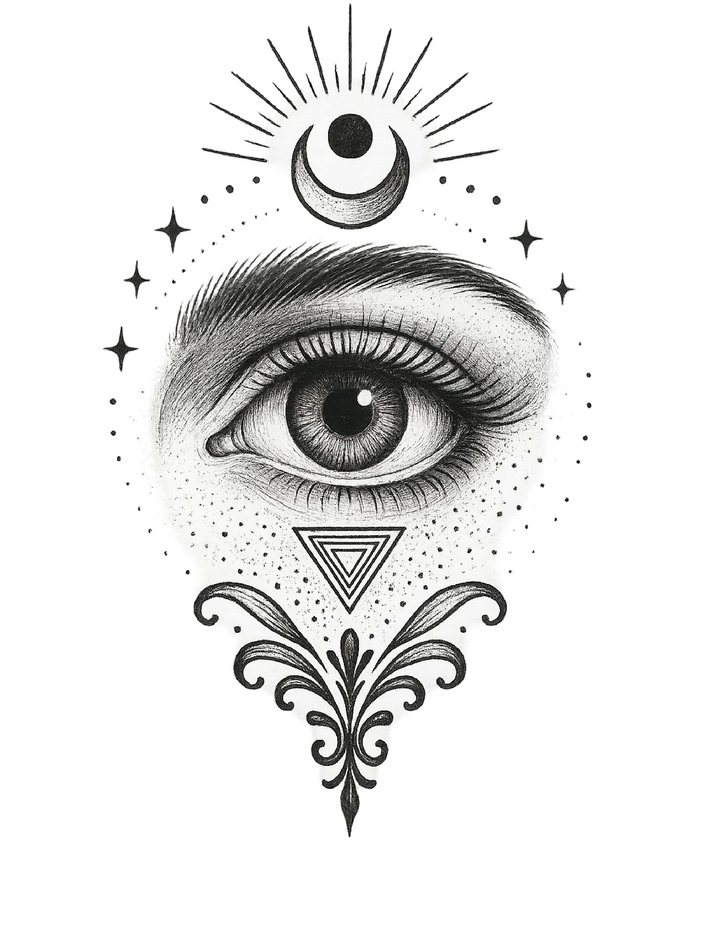 Künstlerische Tattoovorlage mit einem Auge und mystischen Symbolen.