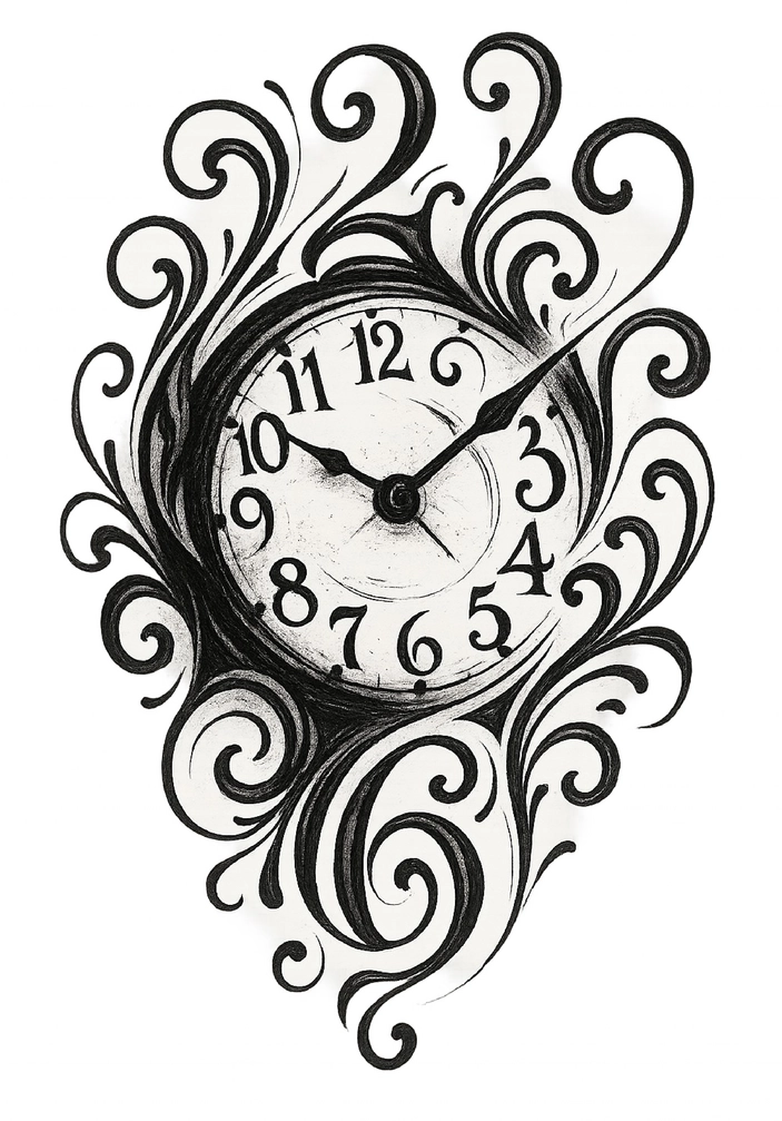 Diese Tattoovorlage zeigt eine kunstvoll gestaltete Uhr, umgeben von eleganten, schwungvollen Ornamenten. Das Design kombiniert klassische Elemente mit einem modernen, künstlerischen Stil und eignet sich ideal für ein individuelles Tattoo auf dem Oberschenkel.