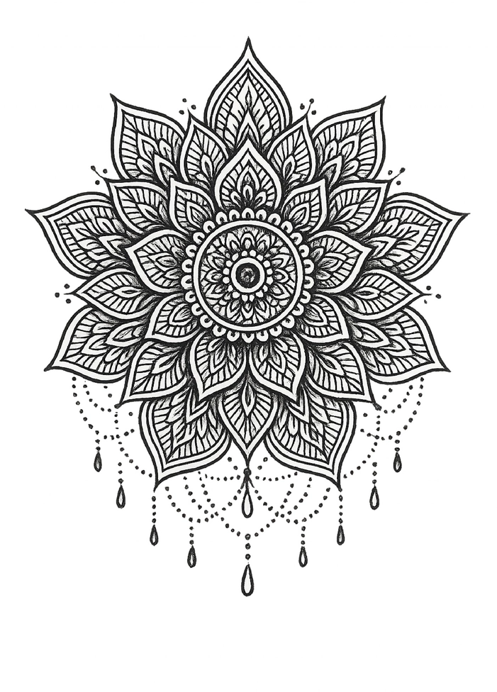 Diese Tattoovorlage zeigt ein kunstvolles Mandala-Design mit feinen Details und eleganten Linien. Die symmetrische Form, die aus Blütenblättern und geometrischen Mustern besteht, vermittelt ein Gefühl von Harmonie und Spiritualität. Die zarten Verzierungen und die hängenden Tropfen am Ende machen das Motiv besonders ansprechend für Tattoos auf der Hand.