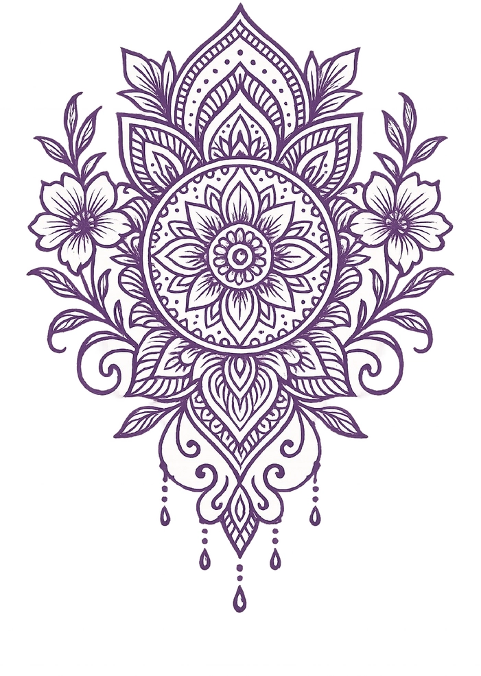 Diese Tattoovorlage zeigt ein kunstvolles Mandala mit floralen und geometrischen Elementen. Die detaillierte Gestaltung und die harmonischen Formen machen dieses Motiv ideal für eine Bauch-Tätowierung, die sowohl feminin als auch ästhetisch ansprechend ist.