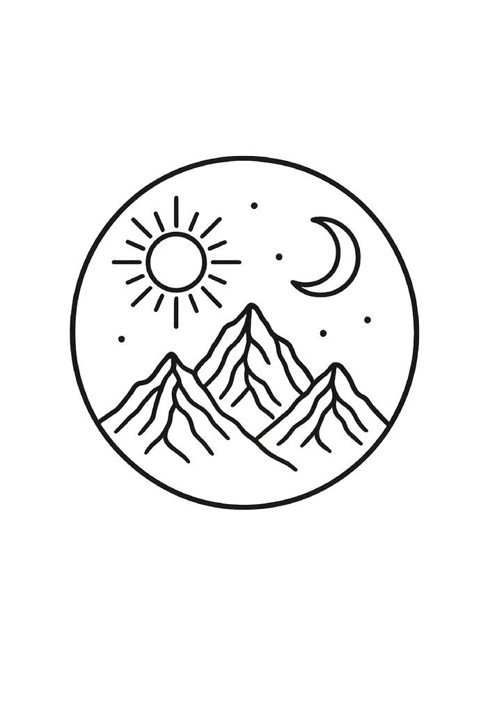 Minimalistische Tattoovorlage mit Bergen, Sonne und Mond für Naturliebhaber.