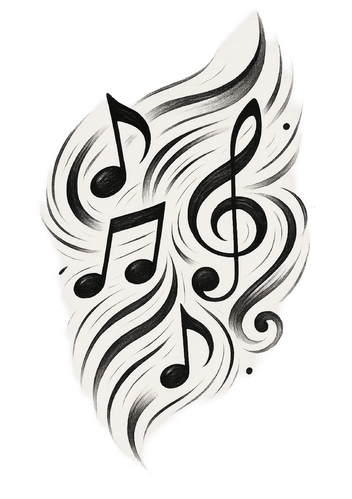 Kreative Tattoovorlage mit Musiknoten und geschwungenen Linien.