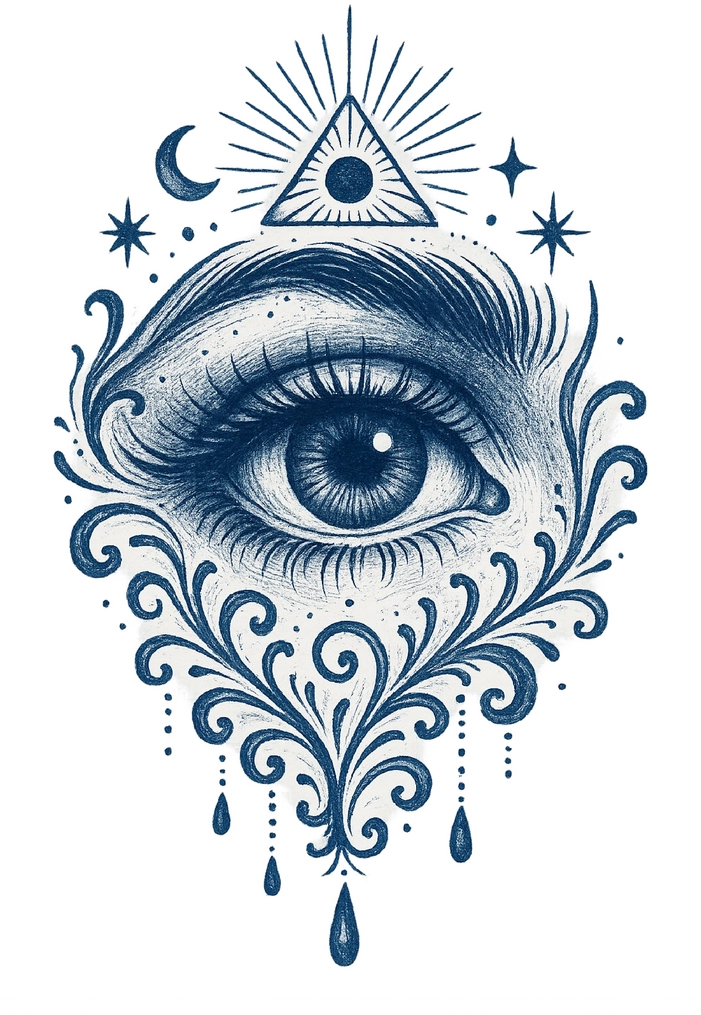 Diese Tattoovorlage zeigt ein mystisches Auge umgeben von symbolischen Elementen.