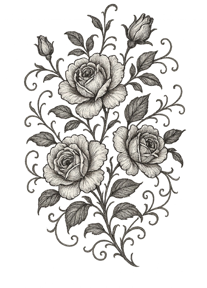 Die Tattoovorlage zeigt ein kunstvolles Arrangement von Rosen, die in einer eleganten, geschwungenen Anordnung angeordnet sind. Die Detailgenauigkeit der Blüten und Blätter verleiht dem Motiv eine romantische Ausstrahlung und eignet sich hervorragend für Tätowierungen auf dem Oberarm.