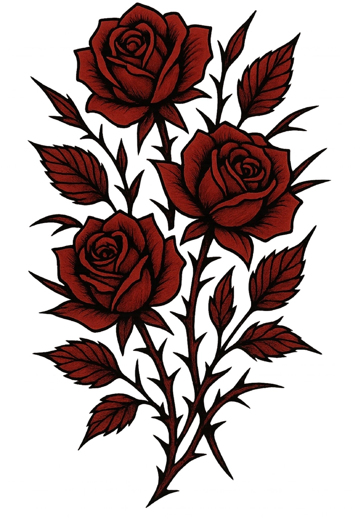 Die Tattoovorlage zeigt ein wunderschönes Rosenbouquet, das aus drei stilisierten, roten Rosen mit charakteristischen Dornen besteht. Die Kombination aus Blüten und Dornen symbolisiert sowohl Schönheit als auch Stärke, was diese Vorlage besonders ansprechend macht.