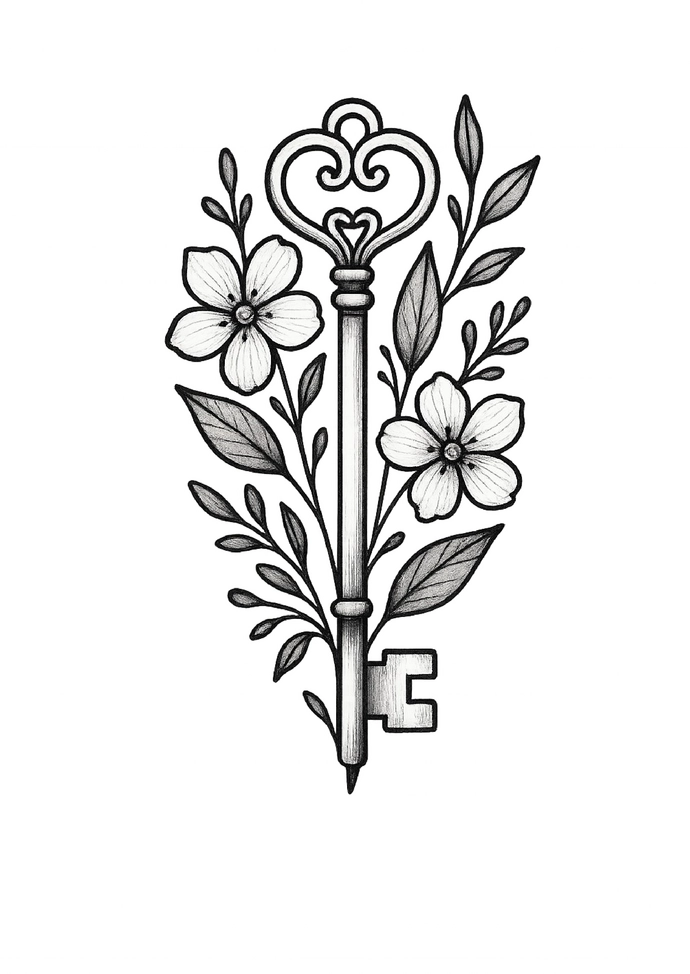 Diese Tattoovorlage zeigt einen schönen Schlüssel, der von zarten blühenden Pflanzen umgeben ist. Der filigrane Stil und die floralen Elemente verleihen dem Design eine romantische Note, perfekt für ein Finger-Tattoo.