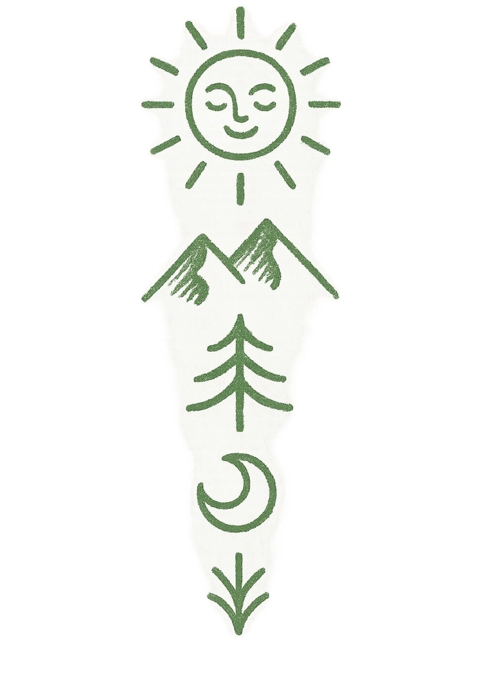 Stilisierte Tattoo-Motive von Sonne, Bergen und Mond symbolisieren die Verbindung zur Natur.