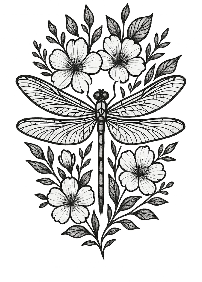 Tattoovorlage mit stilisierter Libelle und floralen Elementen