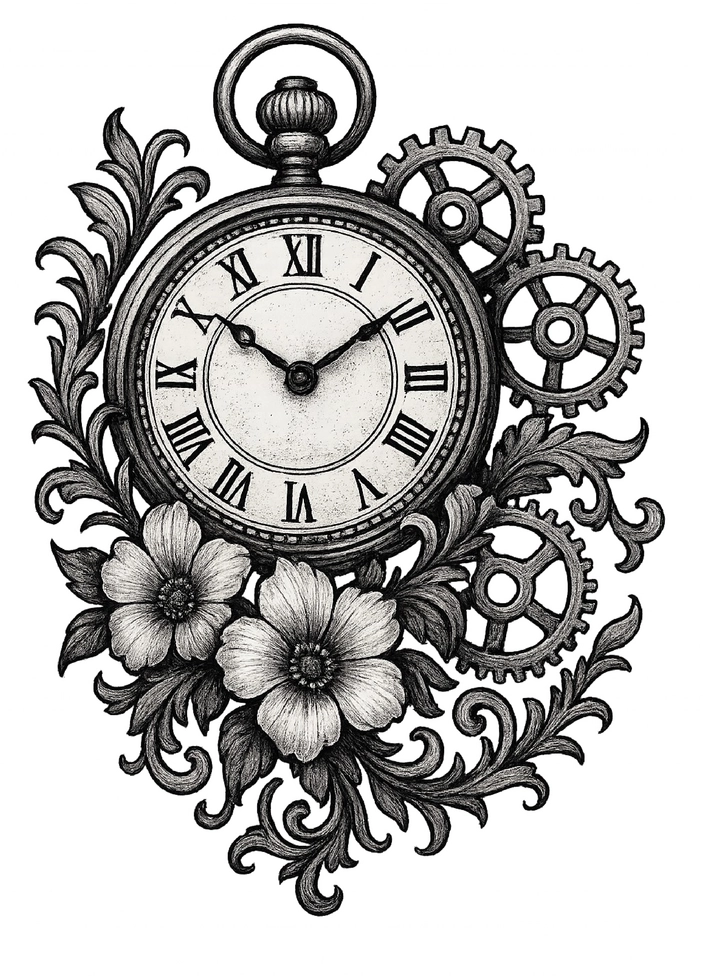 Detailreiche Tattoovorlage mit Uhr, Zahnrädern und Blumenornamenten.