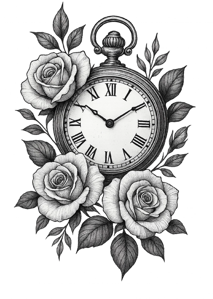 Tattoovorlage mit Uhr und Rosen - zeitloses Design