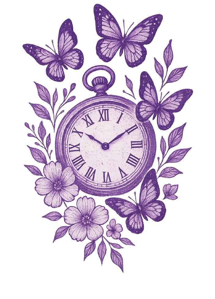 Diese Tattoovorlage zeigt eine detaillierte Uhr, umgeben von kunstvollen Schmetterlingen und zarten Blumen. Das harmonische Zusammenspiel der Elemente vermittelt ein Gefühl von Lebensfreude und Vergänglichkeit, ideal für eine feminine Körperstelle.
