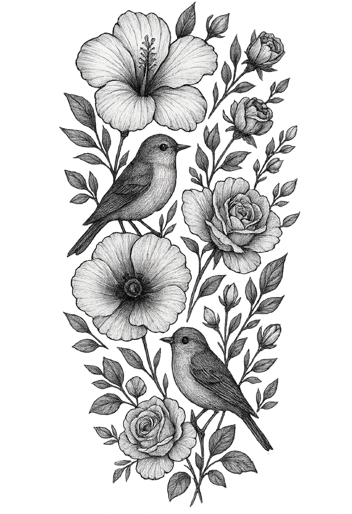Diese Tattoovorlage zeigt eine kunstvolle Komposition aus verschiedenen Vögeln und Blumen. Die filigranen Details der Rosen und Hibiskus verleihen dem Design eine besondere Eleganz, ideal für Frauen, die die Natur und tierische Motive schätzen. Dieses Tattoo eignet sich hervorragend für den Oberschenkel und ist ein wahrer Blickfang.