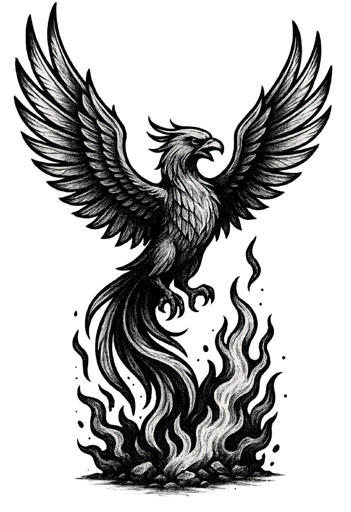 Ein kraftvoller Phoenix, der majestätisch aus den Flammen aufsteigt, als Symbol der Wiedergeburt.