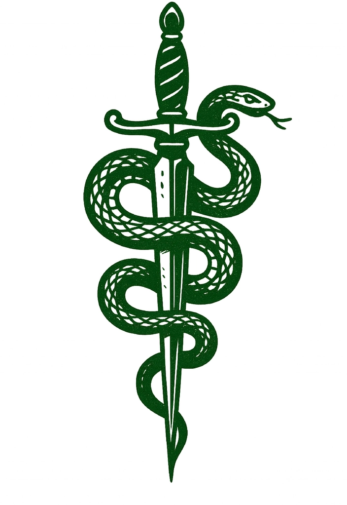 Das Tattoo zeigt eine stilisierte Schlange, die sich elegant um einen Dolch windet. Diese Kombination symbolisiert oft Stärke und Wissen, was es zu einem beliebten Motiv für Männer macht. Die geschwungenen Linien und die kraftvolle Darstellung verleihen dem Bild eine dynamische Ausstrahlung.
