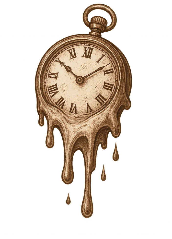 Diese Tattoovorlage zeigt eine stilisierte, schmelzende Uhr, die an die Vergänglichkeit der Zeit erinnert. Die Uhr ist in einem Vintage-Stil gehalten und wirkt, als würde sie sich verflüssigen, was ein faszinierendes und tiefgründiges Motiv darstellt.