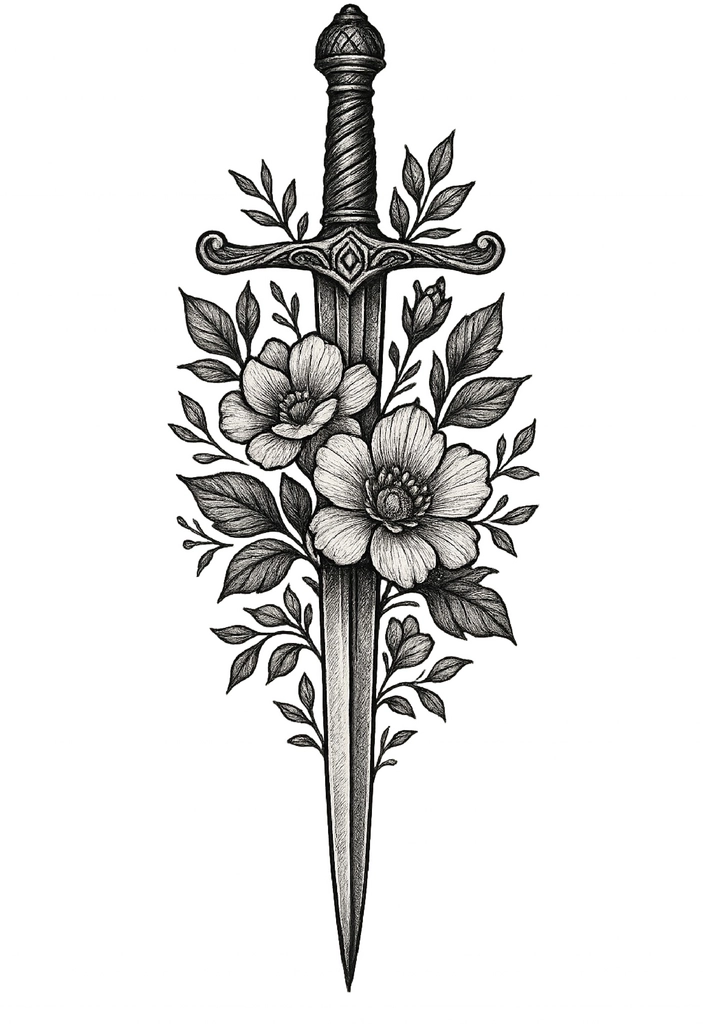 Diese Tattoovorlage zeigt ein beeindruckendes Design mit einem Schwert, das von floralen Mustern umgeben ist. Die Kombination aus Schwert und Blumen vermittelt sowohl Stärke als auch Schönheit, was dieses Tattoo zu einem einzigartigen Kunstwerk macht.