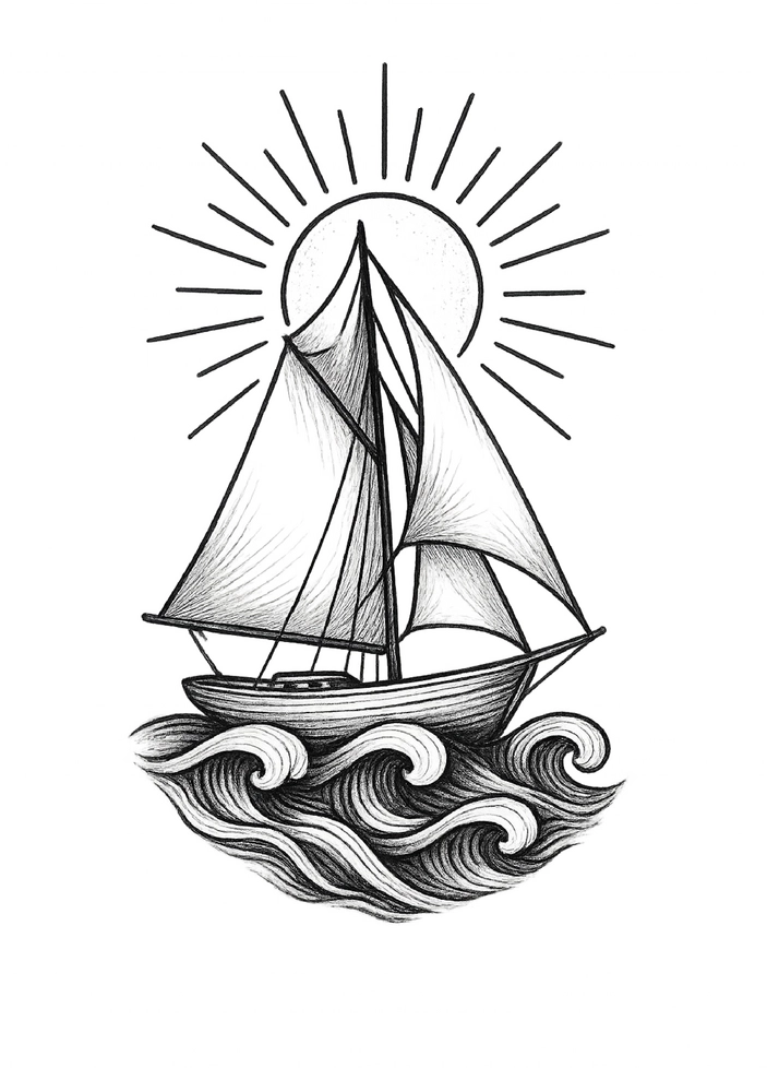 Diese Tattoovorlage zeigt ein elegantes Segelboot, das auf wogenden Wellen fährt, während die Sonne strahlt. Die schwarz-weiße Gestaltung unterstreicht die ästhetische Wirkung des Designs und macht es zu einer idealen Wahl für Tattoo-Enthusiasten, die das Thema Natur schätzen.