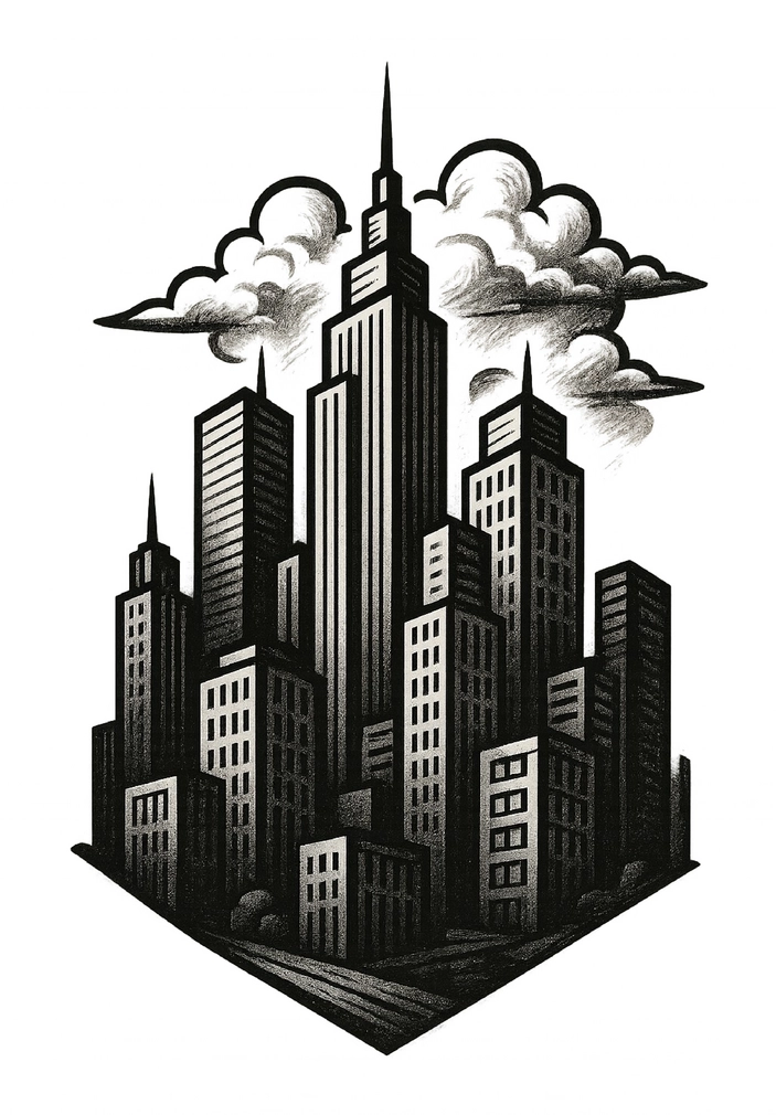 Die Tattoovorlage zeigt eine stilisierte Stadtlandschaft mit beeindruckenden Wolkenkratzern im Schwarz-Weiß-Design.