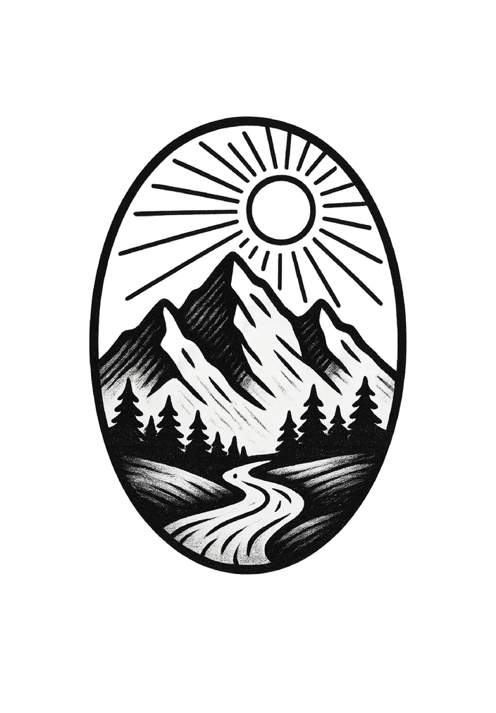 Diese Tattoovorlage zeigt eine stilisierte Berglandschaft mit einer strahlenden Sonne und einem geschwungenen Weg, der durch die Natur führt. Die Kombination aus Bergen und Wäldern vermittelt ein Gefühl von Freiheit und Abenteuer.