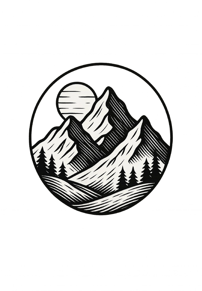 Diese Tattoovorlage zeigt eine stilisierte Berglandschaft mit einer Sonne, umgeben von Tannenbäumen. Die klaren Linien und der Schwarz-Weiß-Kontrast verleihen dem Motiv eine besondere Ästhetik. Ideal für Naturliebhaber, die ihre Leidenschaft für die Berge und die Natur in Form eines Tattoos ausdrücken möchten.