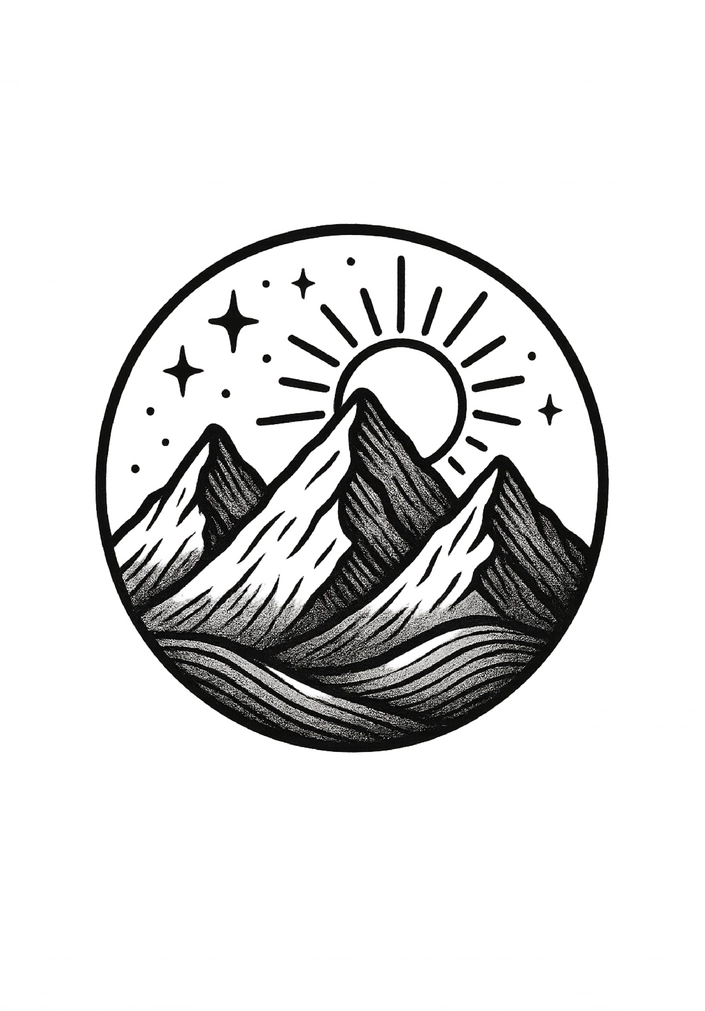 Diese Tattoovorlage zeigt eine stilisierte Berglandschaft mit Sonne und Sternen.